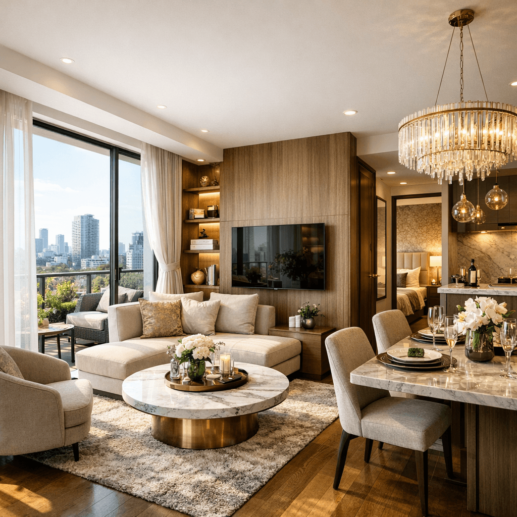 Modern 2LDK apartment in a reinforced-concrete mid-rise typical of central Tokyo, featuring a clean minimalist interior, wide-plank flooring, and large sliding balcony doors that maximize natural light. The open-plan living/dining area connects to a compact, efficient Japanese kitchen with built-in storage, while both bedrooms fit queen-size beds and include wardrobes designed for space-conscious city living.